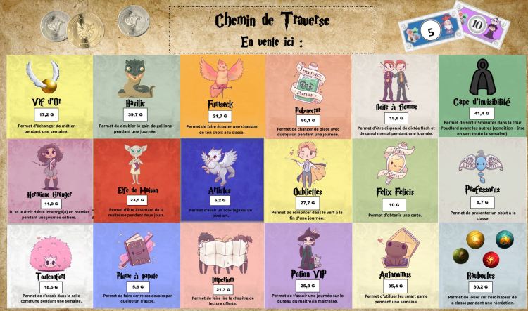 Un fois par semaine se déroule le chemin de Traverse. Chaque maison à leur tour, les élèves viennent au fond de la classe acheter le privilège de son choix. Ils peuvent choisir d’économiser et de seulement « échanger » sa monnaie, en transformant leurs gallions en billets de 5, 10, 20, 50 ou 100 gallions.