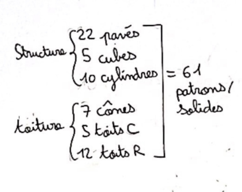 j’ai donné le patron direct à découper, ou pour les plus aisés le patron à reproduire directement sur feuille. Avant de découper, j’ai demandé pour les pavés, les cubes et les cylindres de les colorier en gris et de dessiner un effet « brique » dessus.