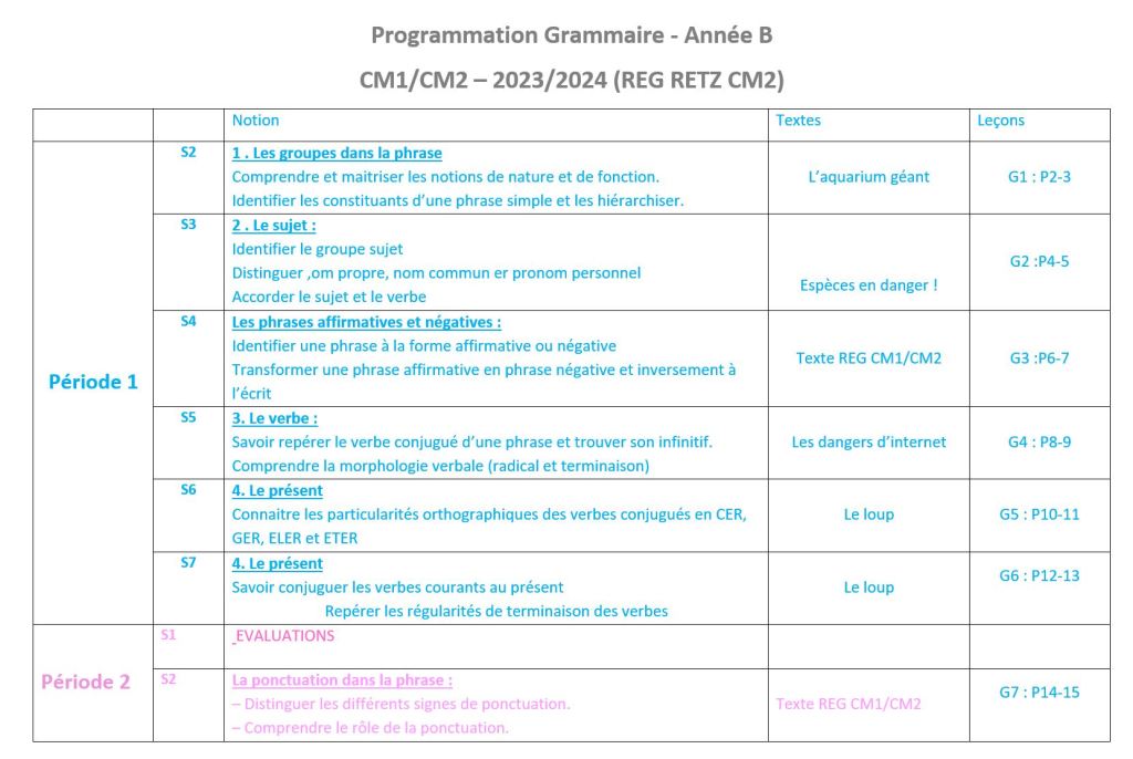 cette programmation ne suit pas celle du manuel CM2, mais celle du manuel CM, afin d’avoir le même fichier de leçons d’une année sur l’autre et la même programmation.